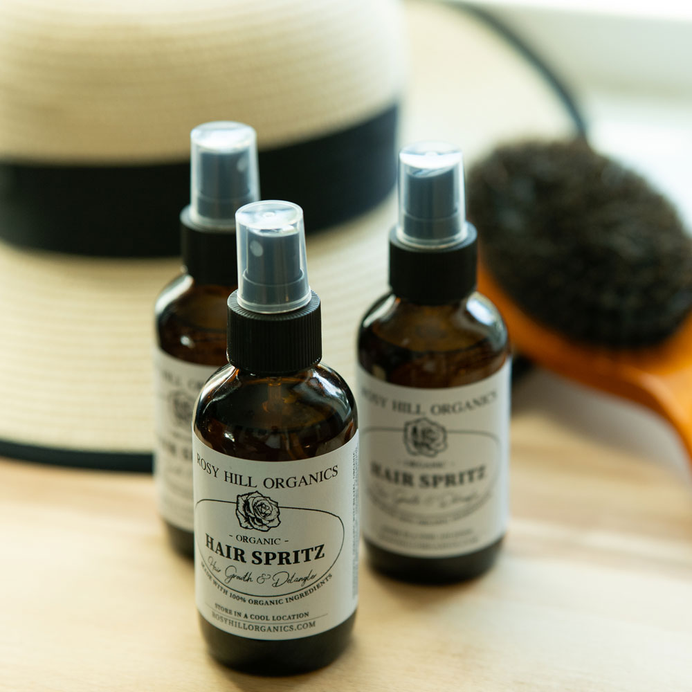 Our Organic Hair Spritz promotes growth, adds volume, and detangles with pure witch hazel, rosemary, cedarwood & lavender.